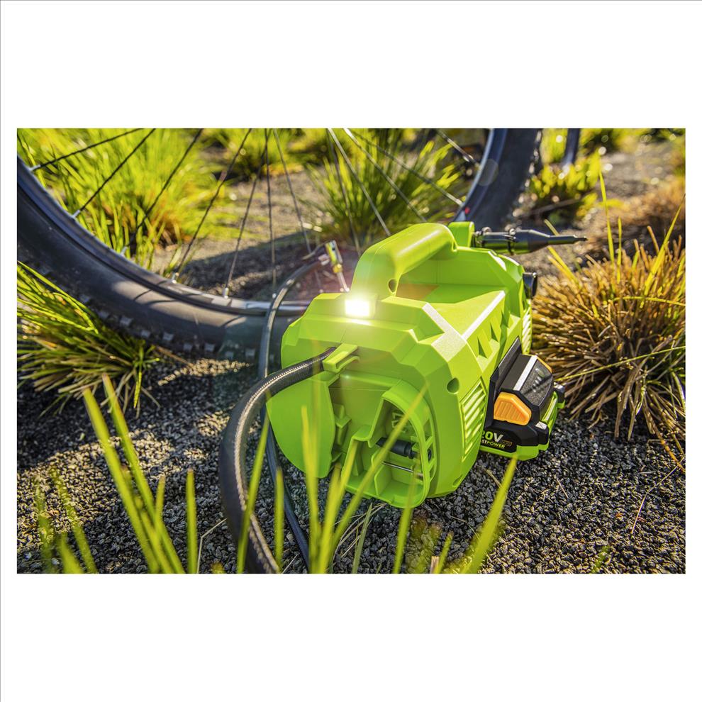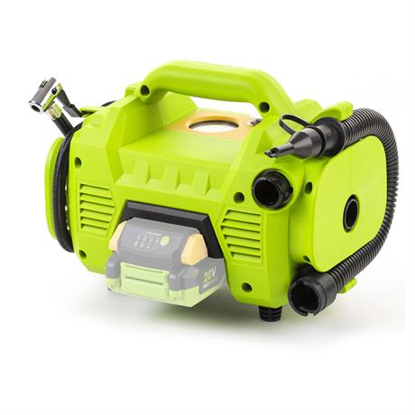 Akumulátorový kompresor Fieldmann FDAK 70205-0 s maximálním výstupním tlakem 10,3 bar a průtokem vzduchu 235 l/min. Vybaven je ergonomickým držadlem pro snadné přenášení. Nabíječka a baterie nejsou součástí balení.