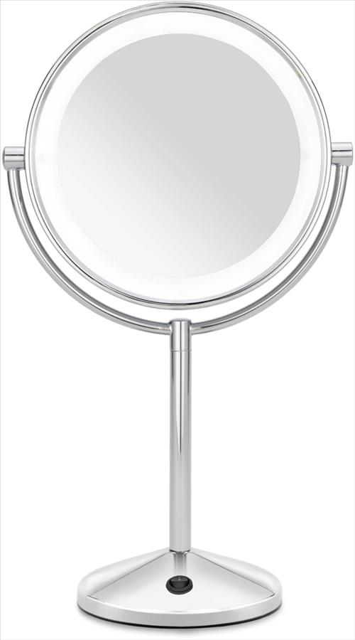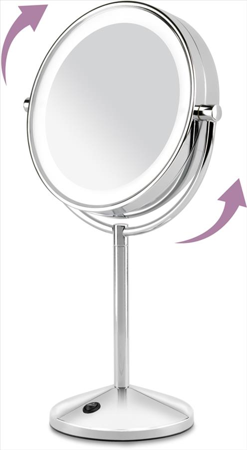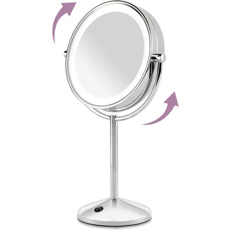 Zrcátko. Dvě zrcadlové plochy. 1, standartní zrcadlová plocha o průměru 19cm. 2, zrcadlová plocha o průměru 19cm s 10x násobným zvětšením. Jemné obrysové LED světlo. Vyžaduje 3x AA baterie (nejsou součástí balení). Zrcadlo je možné horizontálně otáčet. Délka záruky jsou dva roky