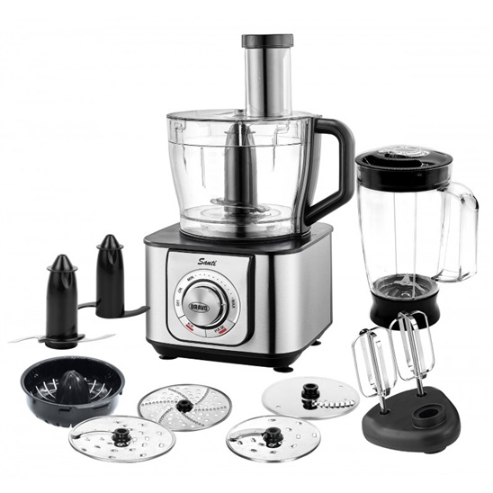7 funkcí v 1 přístroji - šlehání, hnětení, mixování, sekání, strouhání, drcení ledu i citrusovač pro odšťavňování citrusových plodů; velká pracovní mísa o objemu 2,5 l; pro šlehání - mixování je určena plastová mixovací nádoba 1,2 l; sekací nůž můžete použít na sekání; tvrdých surovin; funkce ICE -
