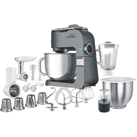 Spolehlivý pomocník do kuchyně, který zvládne hnětení, mixování, mletí masa i něco navíc? Multifunkční kuchyňský robot Sencor STM 7970 si poradí s jakýmkoliv těstem, připraví lahodné smoothie, čerstvě namleté maso, nastrouhá suroviny i nadrtí koření. Díky celokovovému provedení s kovovými převody a silnému 1 700W motoru získáte výkonný spotřebič s dlouhou životností. Planetární systém míchání a inteligentní funkce Smart Power & Energy zajistí optimální otáčky a rovnoměrné promíchání surovin. V balení najdete 2 nerezové mísy o objemu 6 a 6,5 l pro zpracování velkého množství surovin i 1,5l skleněný mixér.