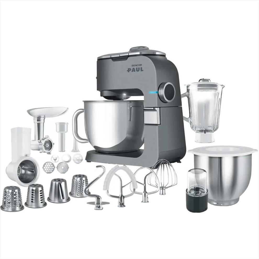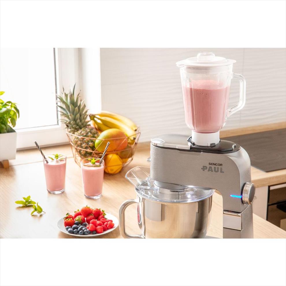 Kuchyňský robot, robustní celokovové tělo s kovovými převody, Sencor Smart Power Energy pro optimální otáčky, funkce Pulse 6,5 a 6 l nerezové nádovy, 1,5 l skleněný mixér, 3 nástavce na hnětení, výkon 1 700W
