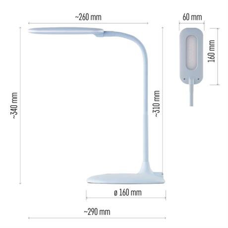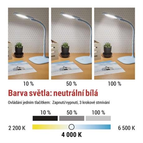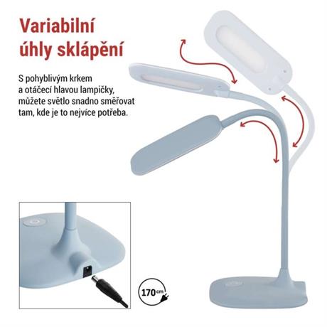barva: modrá|barva světla: neutrální bílá|činitel stárnutí: neuvádí se|čip LED: SMD|délka přívodního kabelu: 1,7 m|energetická třída: A+|energetická třída (od 1.9.2021): neuvádí se|index podání barev (CRI): Ra >80|integrovaná nabíjecí baterie: ne|krytí: IP20|materiál: kov, plast + guma|max. výkon: 6,5 W|napájecí zdroj: 12 V/400 mA|napájecí zdroj součástí balení: ano|napětí: 100–240 V|obsah rtuti: <0 mg|patice (uchycení žárovky): neuvádí se|počet LED: 12|počet spínacích cyklů: 15 000|příkon: 6,5 W|prodejní obal: 1 ks, krabice|rozměr: 160 × 550 × 345 mm|rychlost náběhu na 100 %: 0 s|stmívání: ano|světelný tok: 400 lm|teplota chromatičnosti: 4 000 K|typ napájení: síť|účiník: neuvádí se|USB port: ne|životnost: 30 000 hodin