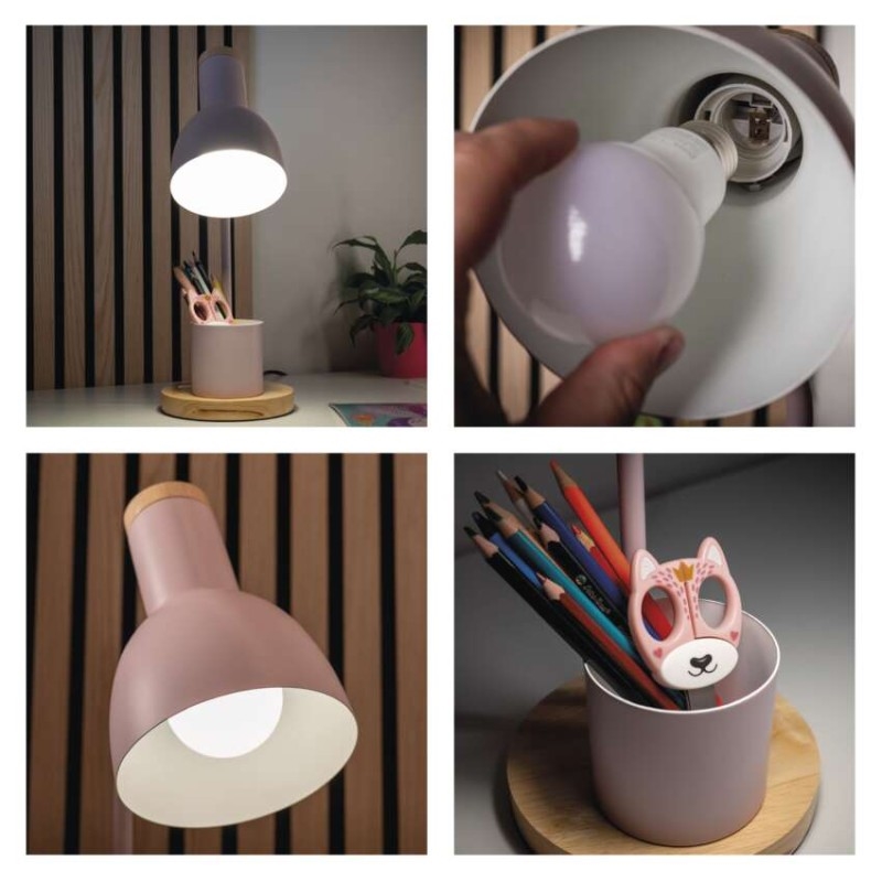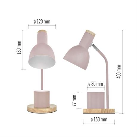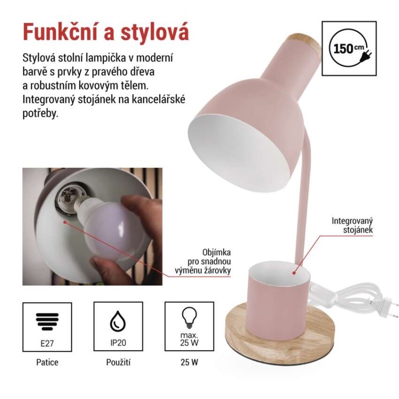 barva: růžová|barva světla: –|činitel stárnutí: –|čip LED: –|délka přívodního kabelu: 1,5 m|energetická třída: –|energetická třída (od 1.9.2021): –|index podání barev (CRI): –|integrovaná nabíjecí baterie: ne|krytí: IP20|materiál: kov + dřevo|max. výkon: 25 W|napájecí zdroj: 220–230 V|napájecí zdroj součástí balení: –|napětí: 220–230 V AC|obsah rtuti: –|patice (uchycení žárovky): E27|počet LED: 0|počet spínacích cyklů: 10 000|příkon: 25 W|prodejní obal: 1 ks, krabice|rozměr: 150 × 150 × 400 mm|rychlost náběhu na 100 %: –|stmívání: ne|světelný tok: –|teplota chromatičnosti: –|typ napájení: síť|účiník: –|USB port: ne|životnost: –