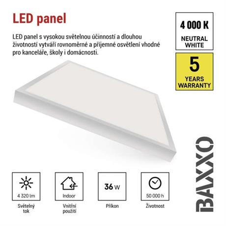 barva světla: neutrální bílá|barva těla: bílá|dálkový ovladač: ne|další funkce: –|do chodby a na schodiště: ano|do dílny a garáže: ne|do kanceláře: ano|do koupelny: ne|do kuchyně: ano|do obýváku, ložnice a dětského pokoje: ano|dosah senzoru: nemá senzor|flicker-free: ano|frekvence: 50/60 Hz|index podání barev (CRI): Ra > 80|jazyky aplikace: –|kategorie: PROFI|kompatibilita: –|krytí: IP20|materiál difuzoru: plast (PS)|materiál LGP: neuvádí se|materiál těla: ocelový plech|montážní otvor: neuvádí se|možnost stmívání: ne|náhrada za žárovku: 4× 18 W CFL|napětí: 220–240 V~|na zahradu a balkon: ne|notifikace do mobilní aplikace: ne|obsah balení: –|ovládání hlasovými asistenty: ne|podporované OS: –|pohybový senzor: ne|přenosová frekvence: –|příkon: 36 W|prodejní obal: 1 ks, krabice|protokol: –|proud: 170 mA|řada: BAXXO|rozměr: 600 × 600 × 50 mm|světelná účinnost: 120 lm/W|světelný tok: 4 320 lm|teplota chromatičnosti: 4 000 K|tvar: čtverec|typ difuzoru: mléčný|typ svítidla: panel|účiník: > 0