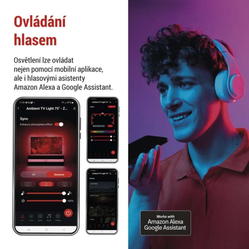 GoSmart Ambientní LED TV osvětlení posouvá zážitek ze sledování televize na zcela novou úroveň. Díky HD synchronizační kameře se podsvícení automaticky přizpůsobuje barvám na obrazovce, čímž vytváří dokonalý vizuální efekt. Veškeré ovládání a nastavení se provádí přes mobilní aplikaci EMOS GoSmart, která je dostupná pro OS Android i iOS.