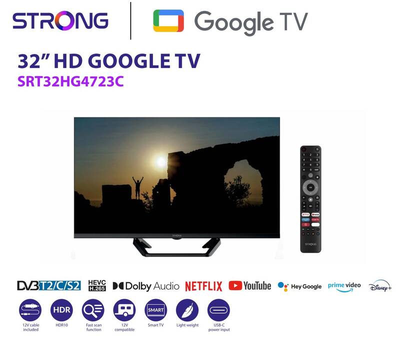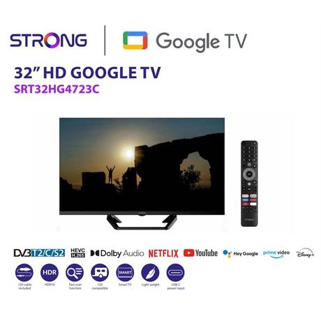 Strong SRT32HG4723C je chytrá televize, která vás vtáhne do světa televizní i online zábavy. Můžete si naladit dostupné stanice, ale také získat přístup k online obsahu včetně streamovacích služeb. Stačí, když přístroj připojíte přes Wi-Fi k dostupné síti a vyberete si z bohaté nabídky aplikací, které vám nabízí operační systém Google TV. Televize se perfektně hodí nejen do domácností, ale např. také na lodě nebo do karavanů, jelikož ji můžete zapojit přes 12V adaptér. HD rozlišení se výborně hodí pro sledování pořadů, filmů i sportovních utkání. Obraz ještě vylepšuje technologie HDR, která pomáhá navýšit jas a kontrast. O výkonný zvuk se stará technologie Dolby Audio. Televizi můžete postavit na dodávaný stojánek, nebo pověsit na stěnu pomocí VESA držáku. Pro připojení externích zatřízení lze využít konektory HDMI nebo USB. Vstupní rozhraní USB-C umožňuje používat externí powerbanku.