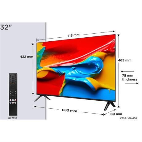 QLED televize, úhlopříčka 32"/80 cm, OS Android, HD Ready 1366 × 768, obnovovací frekvence 60 Hz, HDR10, výkon reproduktorů 16 W, 1x USB, 2x HDMI, LAN, Wi-Fi, BT, Chromecast, Apple TV, Netflix, Disney+