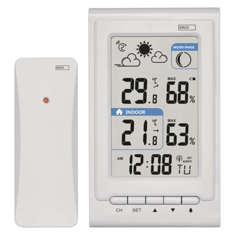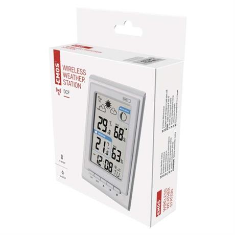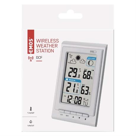 12/24 formát času: ano|anemometr: ne|barevný displej (black mask) podsvícený: ne|barometr: ne|budík: ano|časová pásma: ano|datum: ano|dosah čidla: až 30 m|drátová sonda k čidlu: ne|elektronické plošné podsvícení: ne|fáze měsíce: ano|hodiny: řízené DCF signálem|kalendář: ano|korekce nadmořské výšky: ne|LED podsvícení displeje: ne|min. a max. teplota: ano|možné další čidlo: až 3 čidla (E05018)|možnost nastavení jednotky teploty: °C/°F|možnost pověšení na zeď: ano|napájení čidla: 2× 1,5 V AA (nejsou součástí balení)|napájení stanice: 2× 1,5 V AAA (nejsou součástí balení)|opakované buzení: ano|předpověď počasí: ano|přenosová frekvence: 433 MHz|prodejní obal: 1 ks, krabička|produkt: meteostanice|projekce: ne|provedení: bezdrátové|rozměr čidla: 21 × 38 × 100 mm|rozměr hlavní jednotky: 23 × 76 × 126 mm|síťový adaptér: ne|srážkoměr: ne|teplotní výstraha: ne|trend teploty: ano|trend tlaku: ne|trvalé podsvícení: ne|velikost displeje: 50 × 81 mm|venkovní teplota: -40 °C až +60 °C, rozlišení 0,1