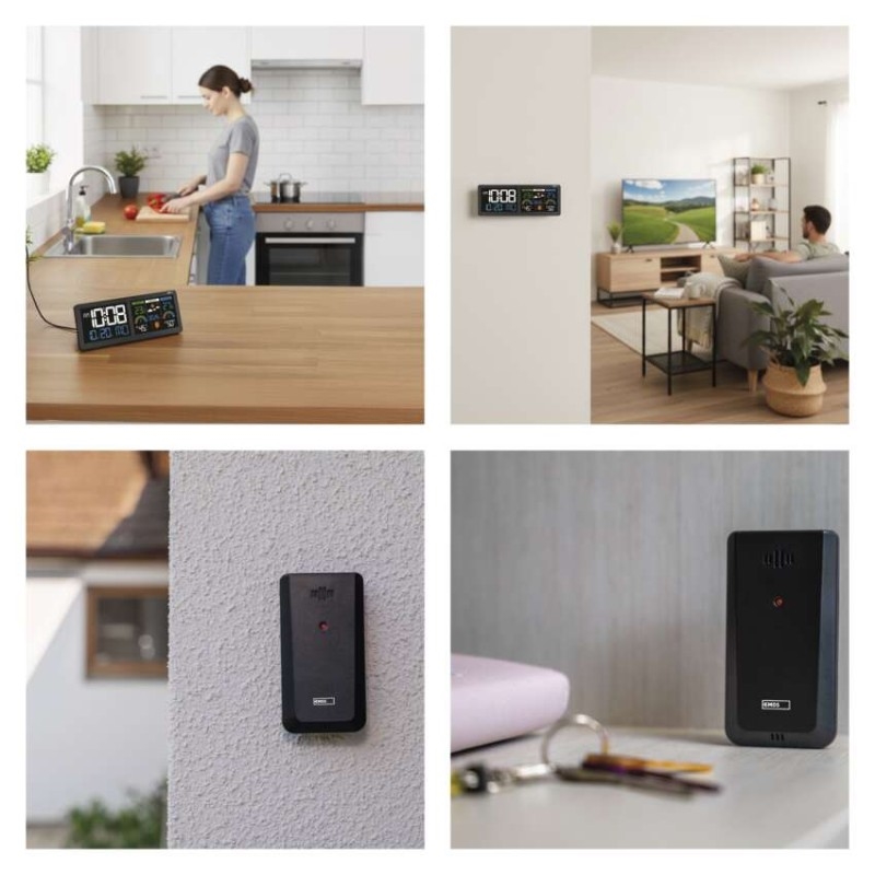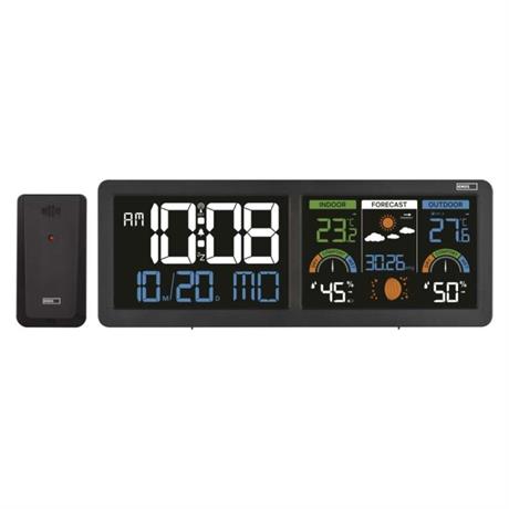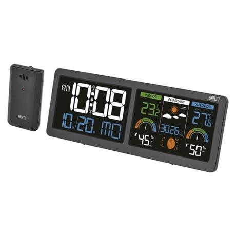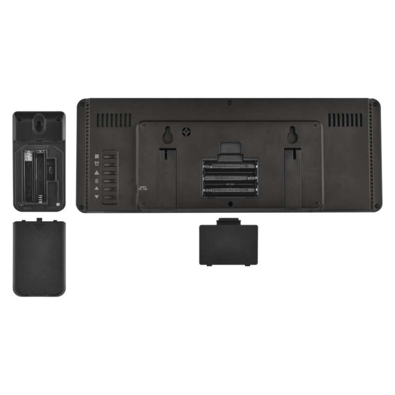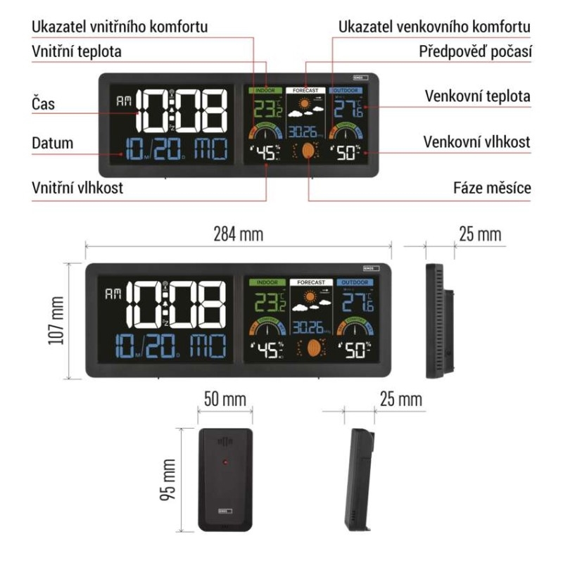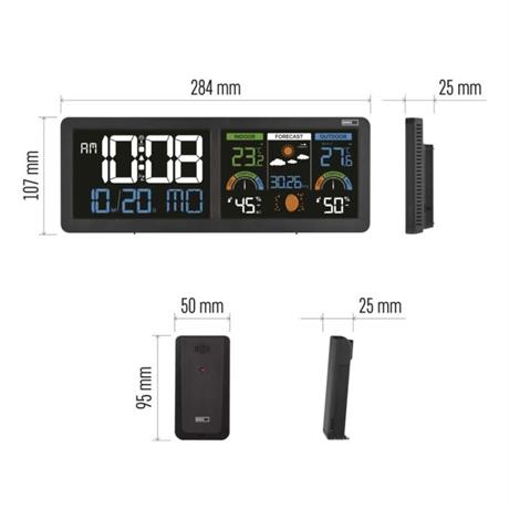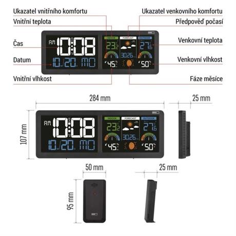 12/24 formát času: ano|anemometr: ne|barevný displej (black mask) podsvícený: ano|barometr: ano|budík: ano|časová pásma: ano|další funkce: –|datum: ano|dosah čidla: až 80 m|drátová sonda k čidlu: ne|elektronické plošné podsvícení: ano|fáze měsíce: ano|hodiny: řízené DCF signálem|kalendář: ano|kompatibilita: –|korekce nadmořské výšky: ne|LED podsvícení displeje: ano|min. a max. teplota: ano|možné další čidlo: až 3 čidla (E05018)|možnost nastavení jednotky teploty: °C/°F|možnost pověšení na zeď: ano|napájení čidla: 2× 1,5 V AAA (nejsou součástí balení)|napájení stanice: 3× 1,5 V AAA (nejsou součástí balení)|notifikace do mobilní aplikace: ne|opakované buzení: ano|ovládání hlasovými asistenty: ne|podporované OS: –|předpověď počasí: ano|přenosová frekvence: 433 MHz|prodejní obal: 1 ks, krabička|produkt: meteostanice|projekce: ne|protokol: –|provedení: bezdrátové|rozměr čidla: 50 × 25 × 95 mm|rozměr hlavní jednotky: 284 × 25 × 107 mm|síťový adaptér: ano, 5 V DC/1 000 mA (součástí balení)|
