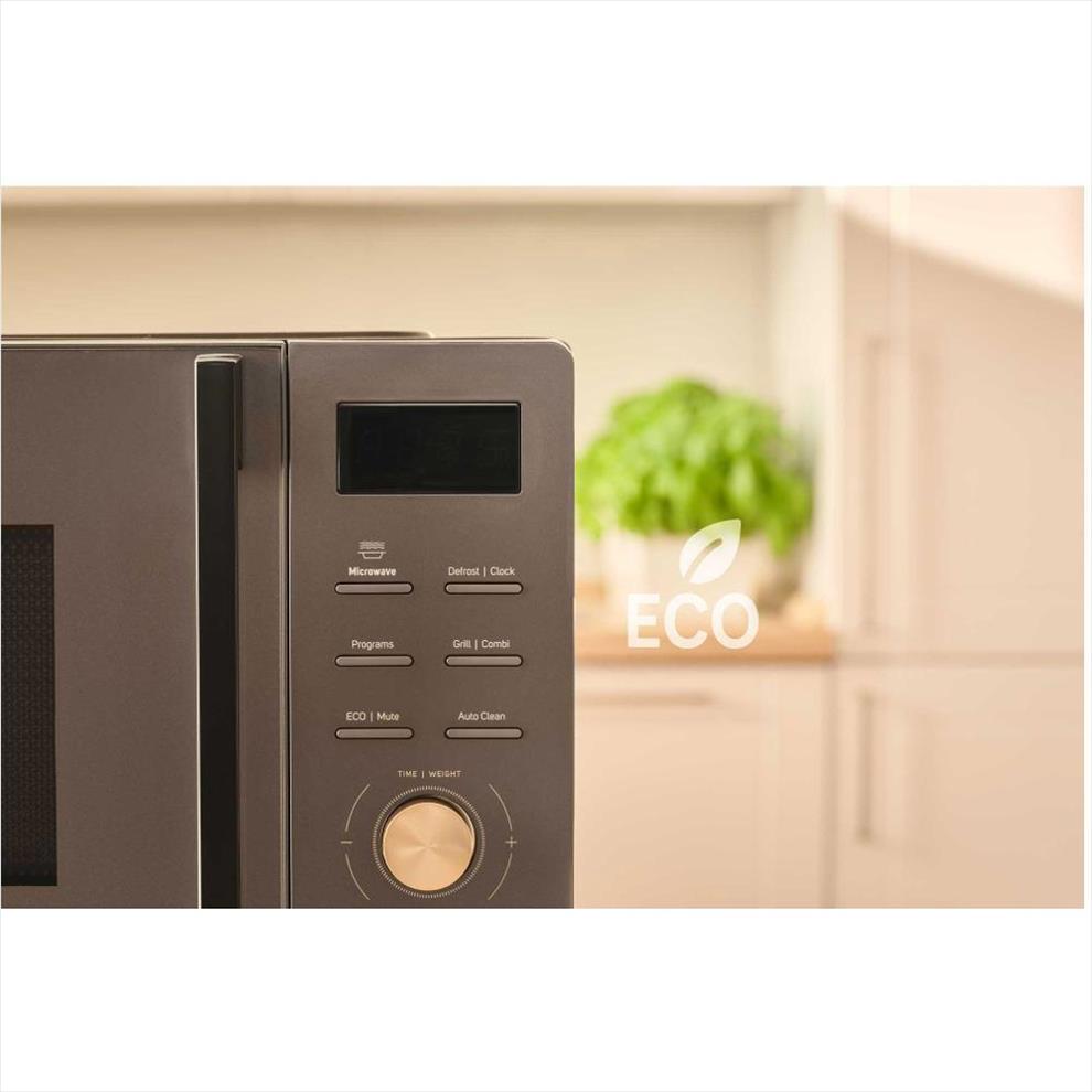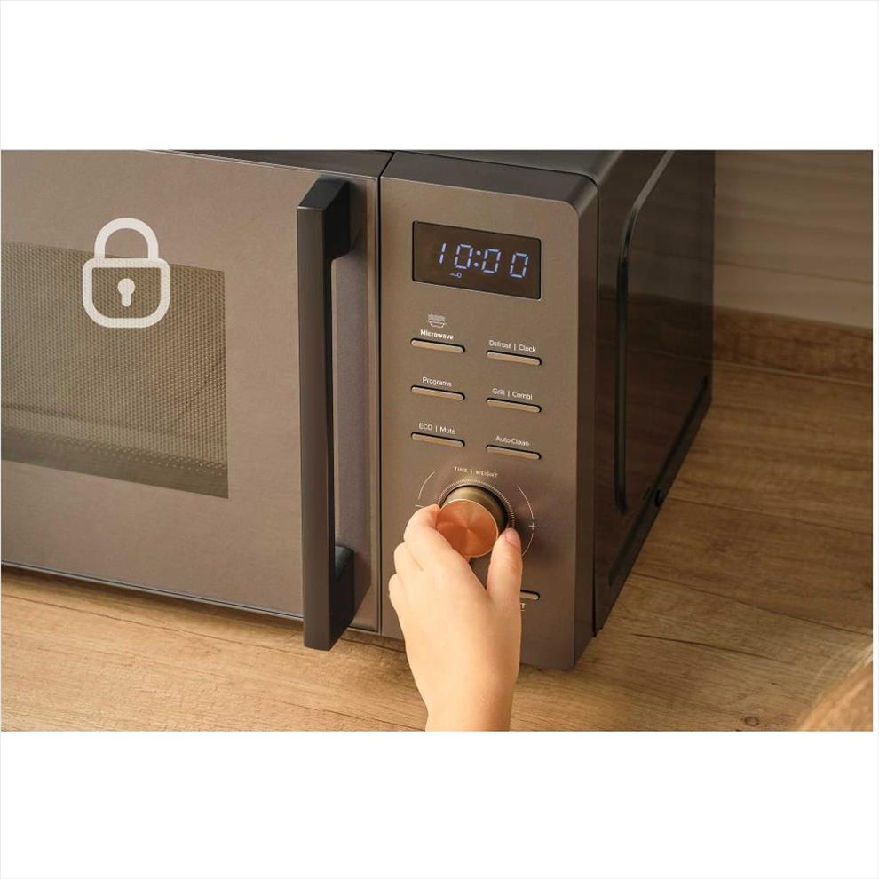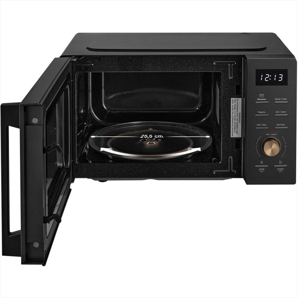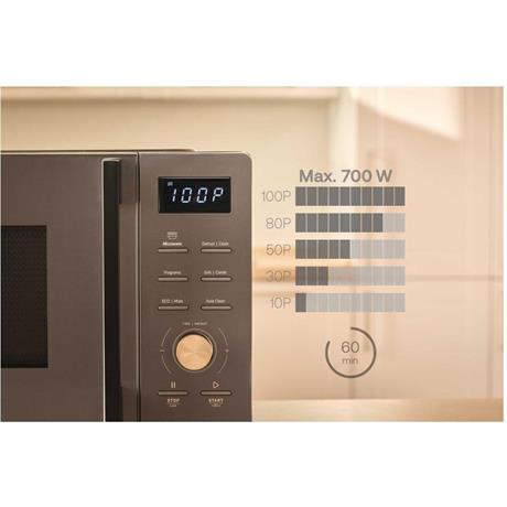 Mikrovlnná trouba, funkce grilu, objem 20 l, elektronické ovládání, LED displej se zobrazením hodin, tlačítko ECO pro vypnutí displeje a úsporu energie, nastavení 5 úrovní mikrovlnného výkonu