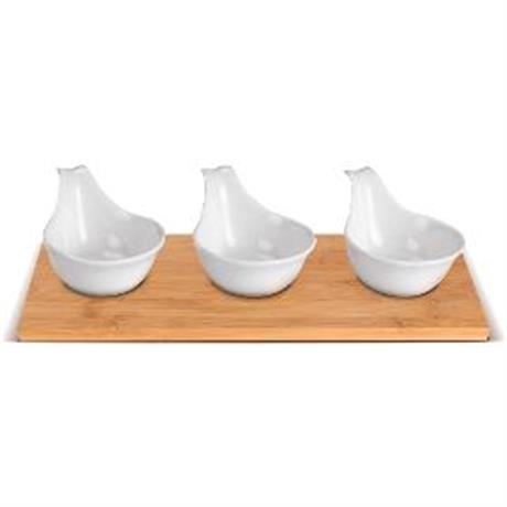 Sada misek 3 ks. LAMART Dine LT9219. . Dřevěný podnos. Vhodné pro každodenní použití. Snadno se udržují a čistí. Ideální pro servírování různých pokrmů nebo občerstvení. . Rozměry 27 x 12 x 1,2 cm. Objem 3x75 ml. . Barva bílá/dřevo