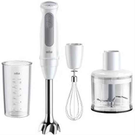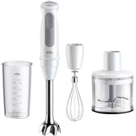 Tyčový mixér. BRAUN MQ50.236.M MultiQuick 5. . Technologie PowerBell Vplus. Technologie SplashControl. Systém EasyClick Plus. Kolečko s 21 rychlostmi. Turbo režim. . Výkon 1000 W. Čepele z nerezové oceli. . Mixovací nádoba 600 ml. Sekací nástavec 500 ml. Šlehací metla. . Délka kabelu 1,2 m. Hmotnost 625 g. . Barva bílá