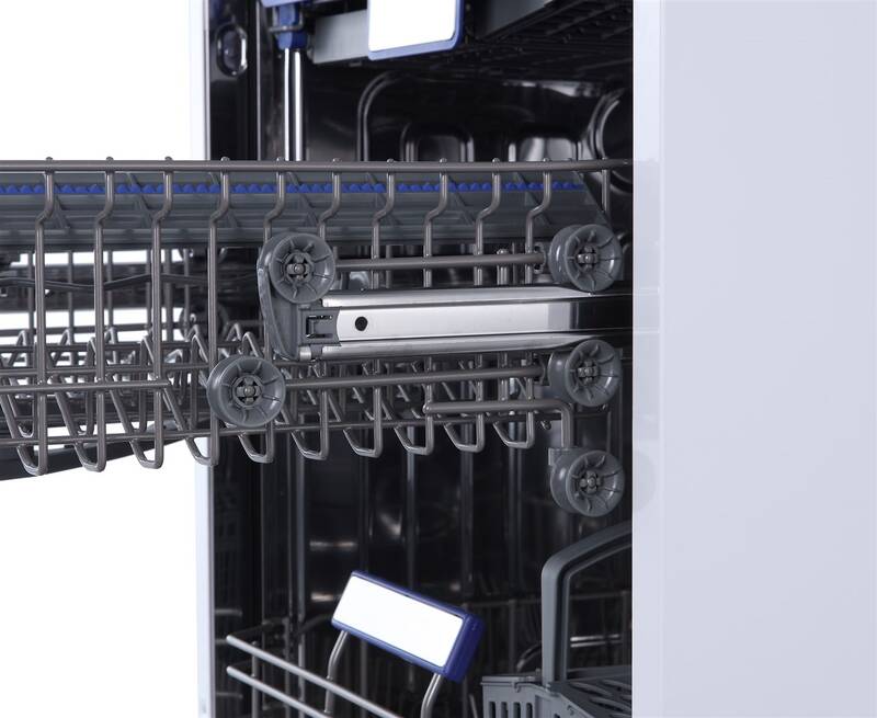 Místo v myčce vám ušetří nastavitelná 3D příborová zásuvka. Její šířka je flexibilní, takže nebude zavazet, pokud budete potřebovat do horního koše myčky umístit i vyšší sklenice. Zároveň už nemusíte používat koš na příbory, takže se vám do spodního koše myčky vleze víc nádobí.