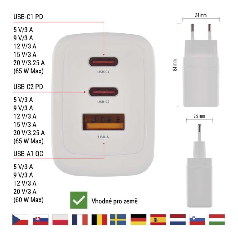 barva: bílá|funkce LED svítilny: neuvádí se|hmotnost: 134 g|kabel: ne|kapacita akumulátoru: neuvádí se|klidový odběr proudu: neuvádí se|LED indikace: ne|LED indikátor nabíjení: neuvádí se|LED indikátor stavu baterie: neuvádí se|max. výstup 1× USB: A: 5 V/3 A - 9 V/3 A - 12 V/3 A - 20 V/3 A (60 W); C1/C2: 5 V/3 A – 9 V/3 A – 12 V/3 A – 15 V/3 A – 20 V/3,25 A (65 W)|max. výstup celkem: 65 W|max. zatížení – stálé: neuvádí se|max. zatížení – ve špičce: neuvádí se|nabíjení: fast|ochrana proti přetížení, přepětí a zkratu: ano|počet USB výstupů: 3|prodejní obal: 1 ks, papírová krabička|produkt: USB adaptér|rozměr: 34 × 94 × 23 mm|rozměr konektoru: neuvádí se|typ baterie: neuvádí se|typ napájení: neuvádí se|určeno pro: smartphone, tablet, notebook|vstupní napětí: 100–240 V~ 50/60 Hz|výstupní napětí: neuvádí se|výstupní proud: neuvádí se