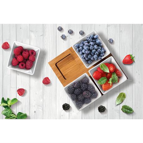 Sada čtyř servírovacích misek s bambusovým podnosem.