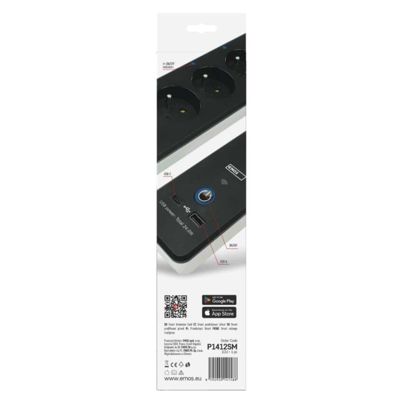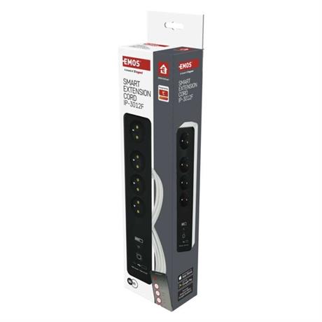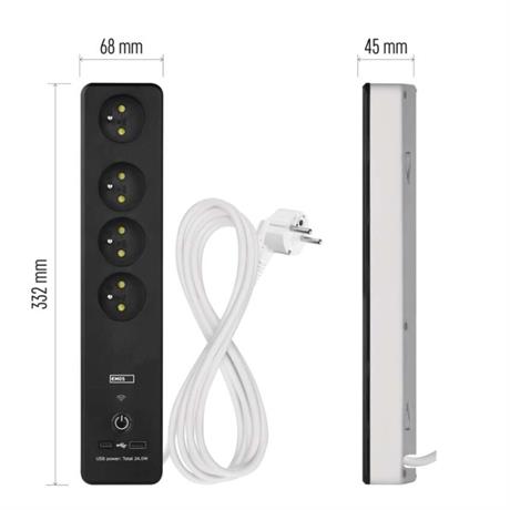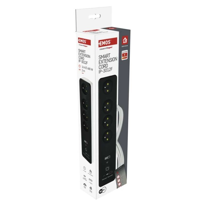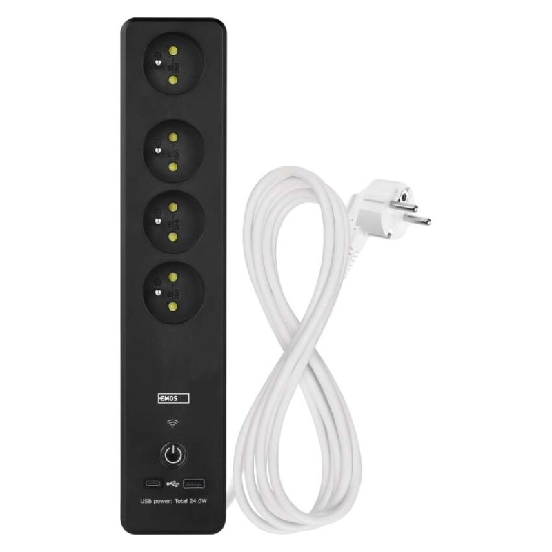 SMART prodlužovací přívod - Wi-Fi. 4 zásuvky + 2 USB výstupy. Přenosová frekvence: 2,4 GHz. Wi-Fi standard IEEE 802.11 b/g/n. Bezpečnostní mechanismy: OPEN/WEP/WPA-PSK/WPA2-PSK. USB výstup typ A + typ C: 5 V DC Max. 4,8 A, Max. 24 W. Platforma TUYA - EMOS GoSMART.