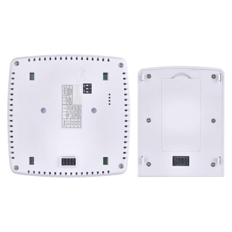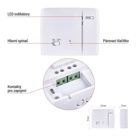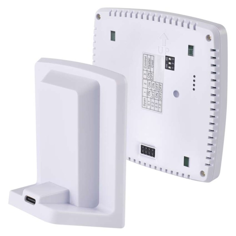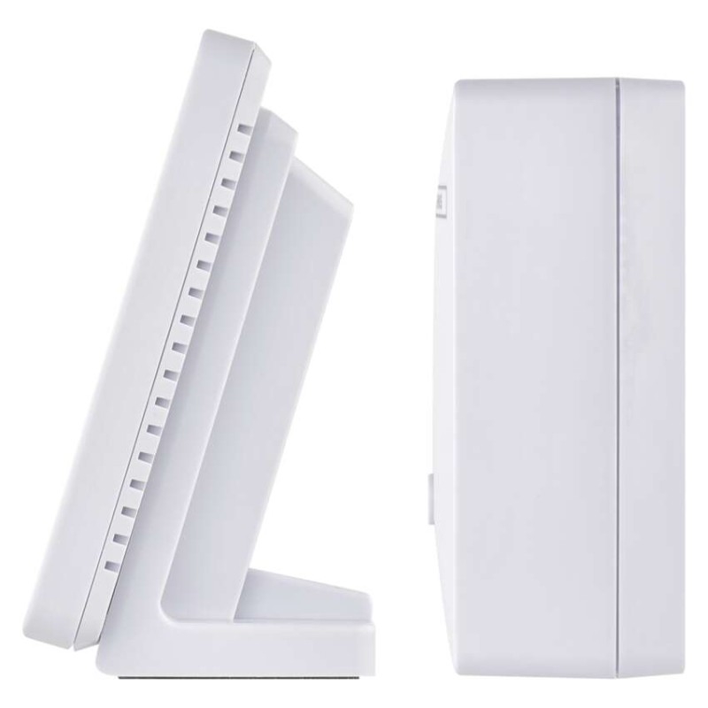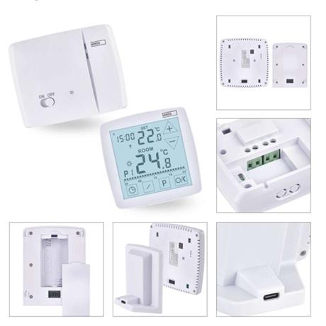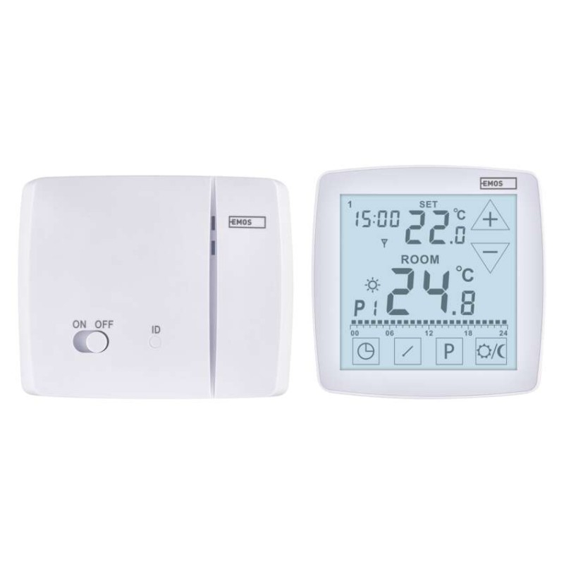 barva: bílá|délka kapilárového čidla: –|dosah ve volném prostoru: 100 m|druh regulace: vytápěcí a chladící systém|funkce ON/OFF: ano|funkce prázdniny: ano|funkce Set-back: ne|jazyky aplikace: –|kalibrace teploty: ano|kompatibilita: –|měření teploty: 0 °C až 40 °C, rozlišení 0,1 °C|možnost propojení s dalšími detektory: ne|napájení: –|napájení brány: –|napájení přijímače: 230 V AC|napájení vysílače: 2× 1,5 V AA (součástí dodávky) nebo 5 V USB adaptér (není součástí dodávky)|nastavení teploty: 7 °C až 30 °C, po 0,2 °C|nastavitelný rozptyl teploty: 0,1 °C, 0,2 °C, 0,5 °C, 1,0 °C|notifikace do mobilní aplikace: ne|ochrana proti zamrznutí: ano|ovládání hlasovými asistenty: ne|počet programů: 6 + 3 uživatelsky nastavitelné|podlahové čidlo: –|podporované OS: –|podsvícený displej: ano|pracovní frekvence: 868 MHz|přenosová frekvence: –|prodejní obal: 1 ks, krabička|protokol: –|rozměr: –|rozměr brány: –|rozměr přijímače: 115 × 37 × 91 mm|rozměr vysílače: 98 × 55 × 98 mm|součást balení: –|spína