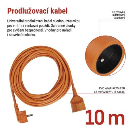 barva kabelu: oranžová|další funkce: ne|délka: 10 m|dětské clonky: ano|hmotnost: –|krytí: IP20|max. zatížení navinutého: –|max. zatížení rozvinutého: 16 A max./3 680 W|napětí: 230 V~|počet zásuvek: 1|prodejní obal: 1 ks, sáček|produkt: prodlužovací přívod – spojka|proud: 16 A|průřez vodiče: 1,5 mm2|rozměr: –|tepelná pojistka: ne|typ izolace: PVC|vodič: H05VV-F3G|záruční doba: 2 roky