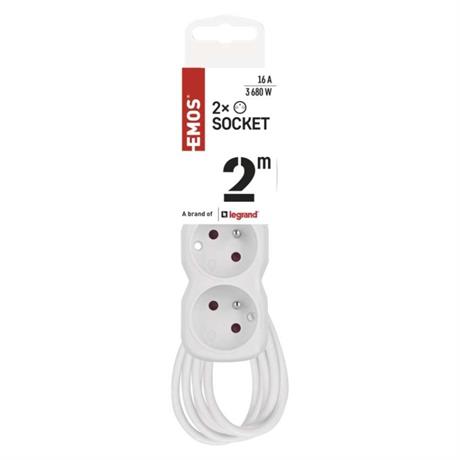 Bílý prodlužovací přívod, 2 zásuvky s dětskými clonkami, vypínačem, délkou 2 m. Průřezem vodiče 1 mm2. Vhodný pro maximální zátěž 16 A max.