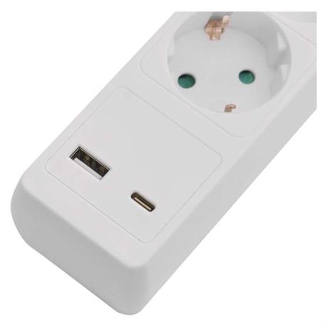 Prodlužovací přívod s vypínačem. 250V~/16A max. 3 zásuvky s dětskými clonkami - SCHUKO systém. USB A+C 3,4 A, 17 W max. Délka přívodního kabelu 2 m. Vodič H05VV-F3G 1,5mm2.