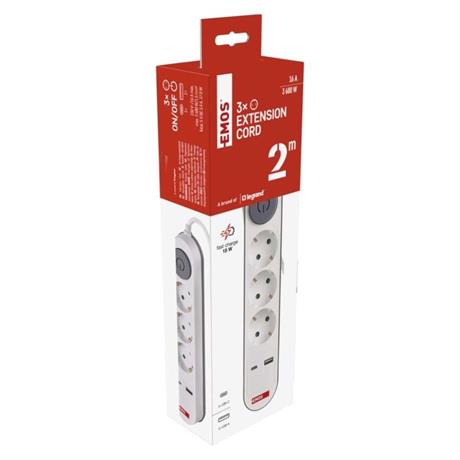 Prodlužovací přívod s vypínačem. 250V~/16A max. 3 zásuvky s dětskými clonkami - SCHUKO systém. USB A+C 3,4 A, 17 W max. Délka přívodního kabelu 2 m. Vodič H05VV-F3G 1,5mm2.
