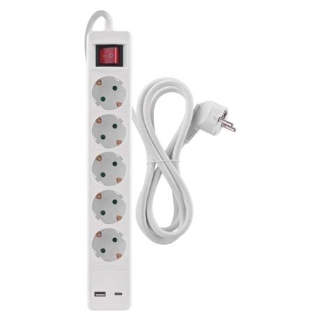 Prodlužovací přívod s vypínačem. 250V~/16A max. 5 zásuvek s dětskými clonkami - SCHUKO systém. USB A+C 3,4 A, 17 W max. Délka přívodního kabelu 3 m. Vodič H05VV-F3G 1,5mm2.