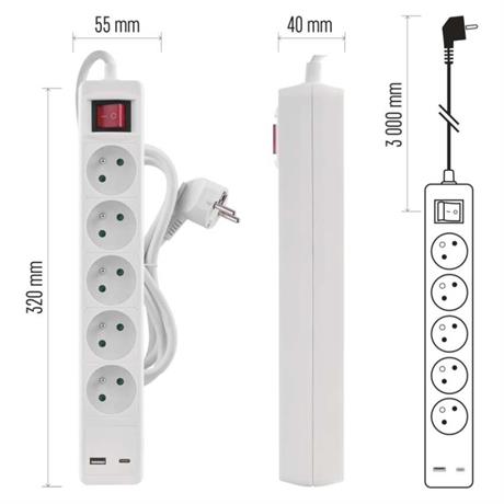 Prodlužovací přívod s vypínačem. 250V~/16A max. 5 zásuvek s dětskými clonkami. USB A+C 3,4 A, 17 W max. Délka přívodního kabelu 3 m. Vodič H05VV-F3G 1,5mm2.