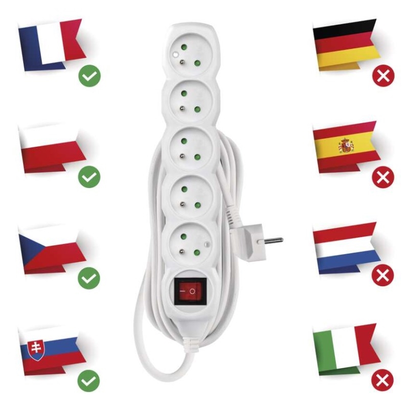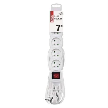 Bílý prodlužovací přívod, 5 zásuvka s vypínačem, délkou 7 m a průřezem vodiče 1 mm2. Vhodný pro maximální zátěž 10 A max.
