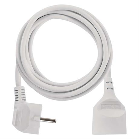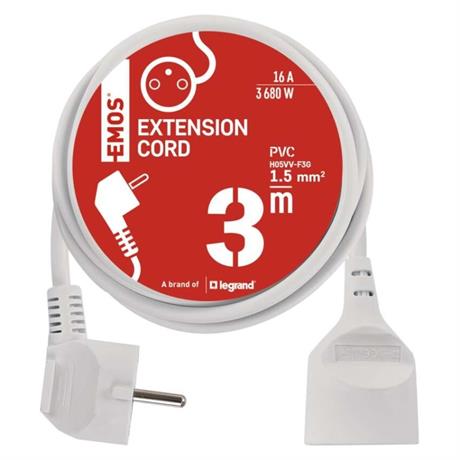 Bílý prodlužovací přívod s jednou zásuvkou - spojka, délkou 3 m a průřezem vodiče 1,5 mm2. Vhodný pro maximální zátěž 16 A max.