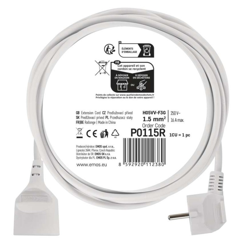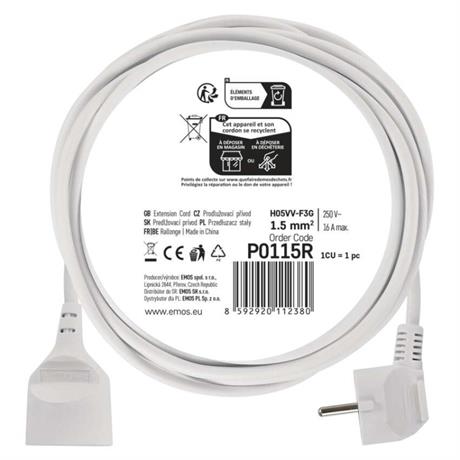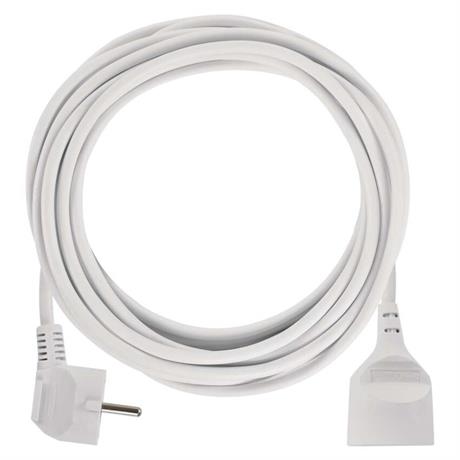 Bílý prodlužovací přívod s jednou zásuvkou - spojka, délkou 5 m a průřezem vodiče 1,5 mm2. Vhodný pro maximální zátěž 16 A max.