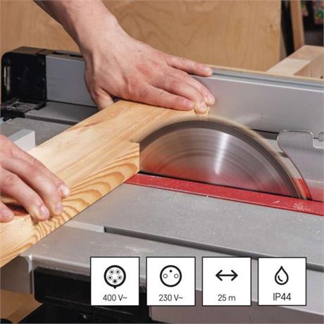 Při práci oceníte možnost připojení zařízení vyžadující tři fáze, a to při zatížení navinutého kabelu 400 V~: 6,25 A max./2 500 W a při rozvinutém kabelu 400 V~: 12,5 A max./5 000 W. Navíc je možno připojit další dvě zařízení na 230 V do dvou zásuvek, kterými prodlužovací kabel také disponuje.