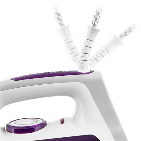 Napařovací žehlička s keramickou žehlicí plochou ve fialovém provedení. Otočná koncovka přívodního kabelu zamezuje zamotávání šňůry.