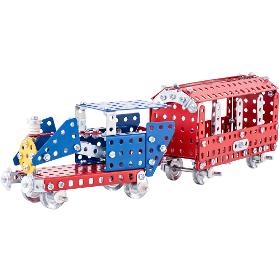 Z této jednovrstvé stavebnice Merkur se dá sestavit 10 různých modelů např. lokomotivu nebo nákladní vagón