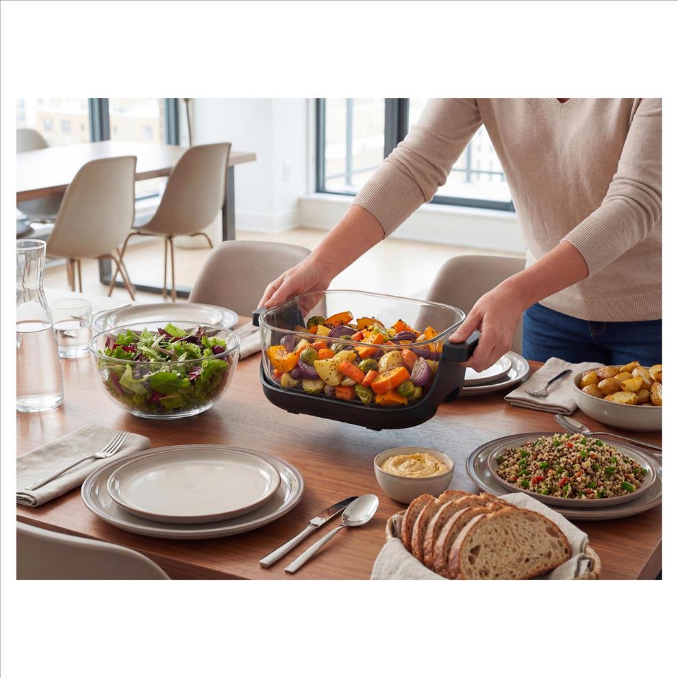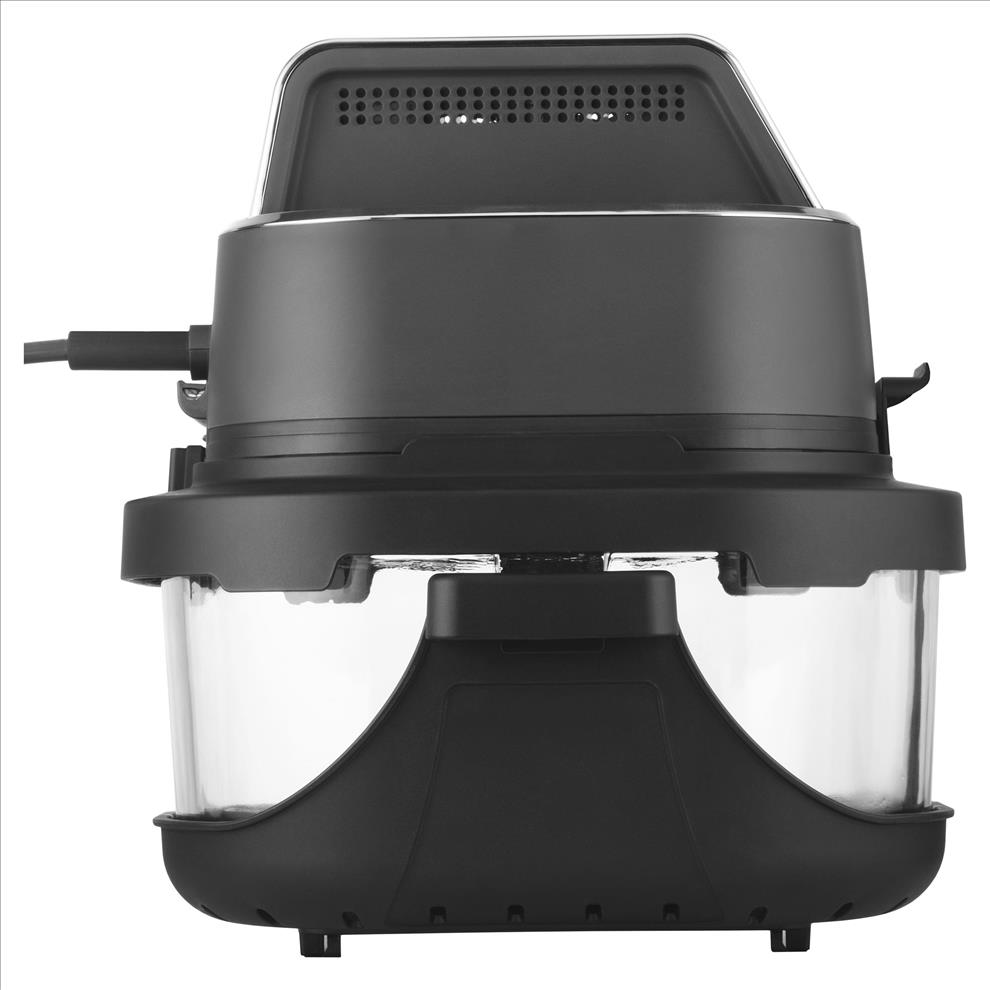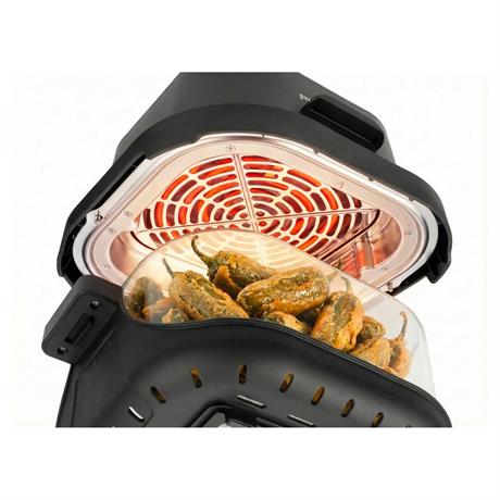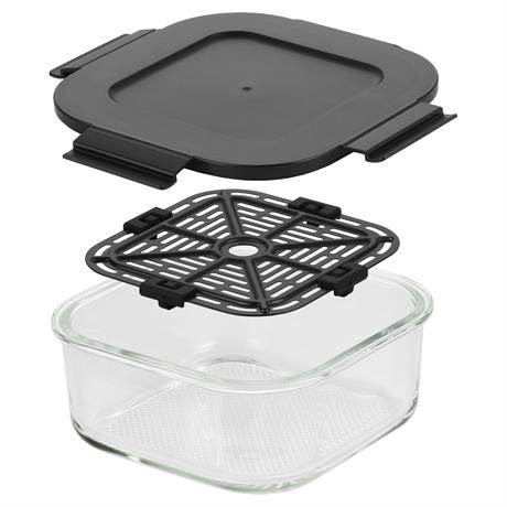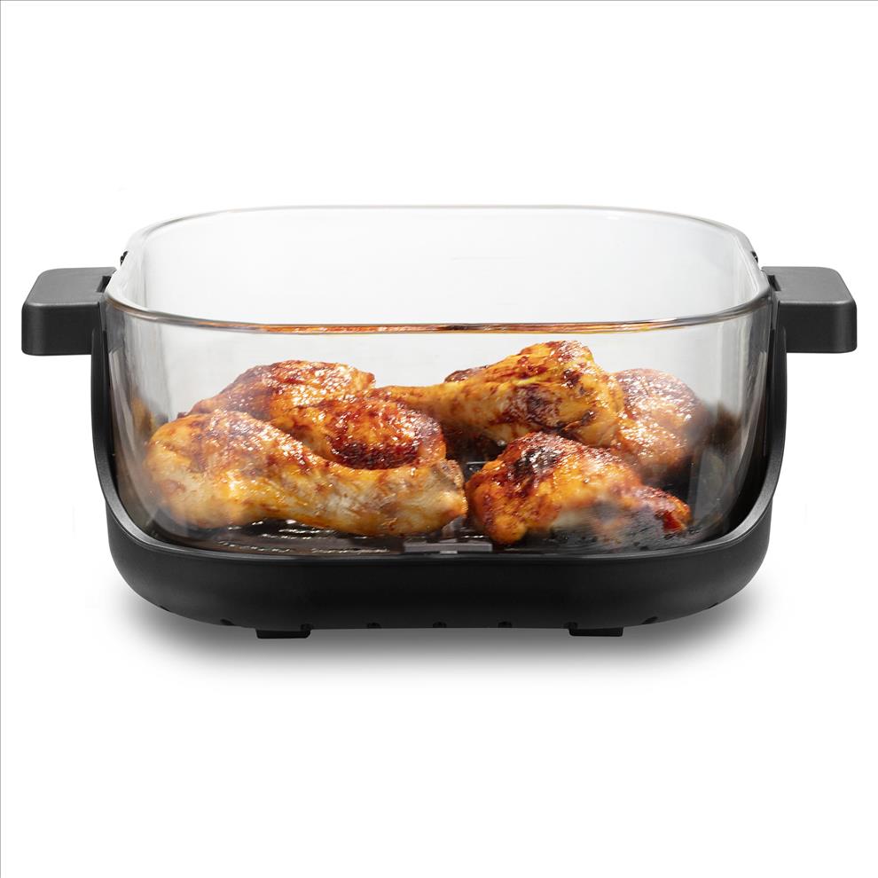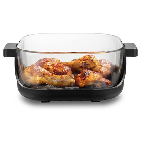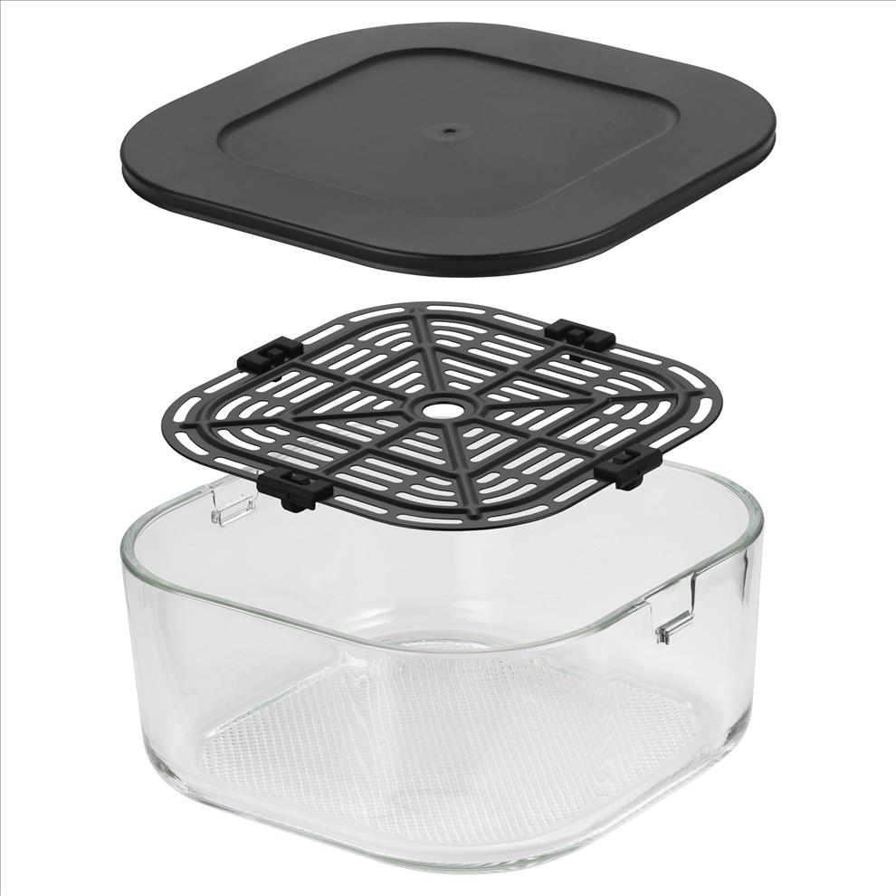 Každá nádoba má držák s uchy a hned po uvaření se dá rovnou použít jako skleněný pekáč na stůl, ze kterého můžete servírovat. Také má víčko, kterým ji uzavřete, a po vychladnutí uložíte do lednice nebo vezmete s sebou třeba do práce. Tato fritéza je navržena tak, že se celá ohřevná jednotka na jednotlivé nádoby přikládá shora, takový „tyčák styl“. Do nádoby dáte jídlo, na nádobu nasadíte ohřevnou jednotku, na dotykovém displeji nastavíte jeden ze 4 režimů a můžete pozorovat, jak se vaše jídlo připravuje. Využít můžete klasické fritování horkým vzduchem, pečení, extra křupavé pečení a pak super vychytávku ohřívání do křupava, se kterým bude včerejší jídlo po ohřátí skvěle křupavé.
