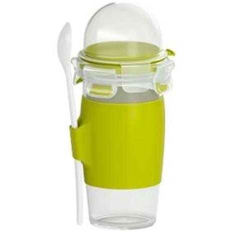 Box na potraviny. Tefal Masterseal To Go N1071410 0,45 l. . Cestovní láhev s objemem 0,45 l. Systém uzavírání se 4 klipy po stranách. Oddělené přihrádky pro jogurt a vaše oblíbené přílohy. Praktická lžíce a ergonomická rukojeť. Vodotěsný design. V zelené barvě
