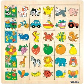 Skládačka. WOODY Přilož kam co patří. . Obrázková skládanka pomáhá dětem rozpoznávat a uvědomovat si předměty, které mohou vidět kolem sebe. Hra procvičuje jejich bystrost a schopnost soustředit se. . Na začátek řádku patří vždy jeden hromadný obrázek. Dítě má za úkol přiřazovat do řádku jednotlivé samostatné obrázky, které tam dle obsahu náleží. . Věk 3+. 36 dílků