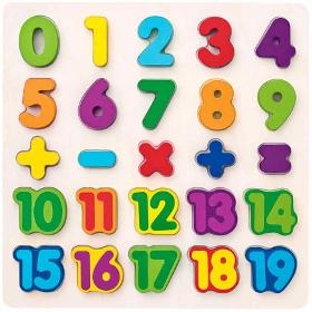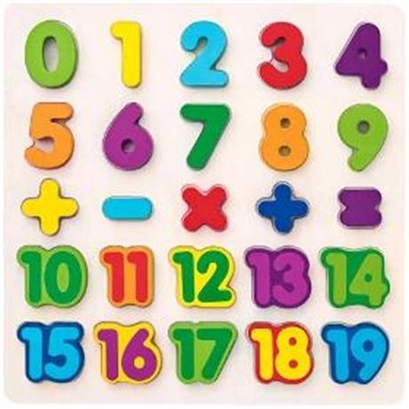Puzzle. WOODY Puzzle Číslice na desce. . Dítě vkládá číslice do správných výseků. Může skládat a procvičovat i jednoduché matematické příklady. Vhodné pro předškoláky. . 25 dílků. . Věk 3+. Rozměr (VxŠxH) 30 x 30 x 1,8 cm
