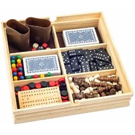 Stolní hry. WOODY Soubor her - velký. . Několik stolních her v jednom dřevěném boxu. Šachy, dáma, člověče nezlob se, vrchcáby, backgammon, mlýn, kameny pro domino, kostky a karty. Obsahuje i návody ke hrám. . Věk 5+. Rozměry (VxŠxH) 7 x 27 x 27 cm