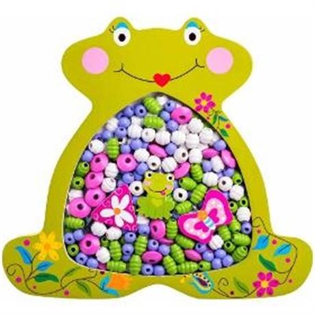 Korálky. WOODY Navlékací korálky Žabka. . Barevné korálky různých tvarů. Korálky s motivem žabky. Šňůrky k navlékání. . Dřevěná žabka, ve které jsou korálky umístěny, slouží zároveň jako rámeček na fotografii. Rámeček je vybaven kováním na zavěšení. . Věk 3+. Rozměry (VxŠxH) 21,7 x 19,5 x 1,9 cm