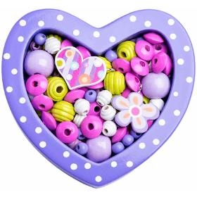 Korálky. WOODY Navlékací korálky Srdíčko fialová. . Sada obsahuje velké množství korálků různých tvarů. Součástí také tenké tkanice s koncovkou k provlékání. Vhodné pro rozvoj jemné motoriky. Baleno v dřevěné krabičce ve tvaru srdíčka. . Věk 3+. Rozměry 18 x 15 cm. . Barva fialová