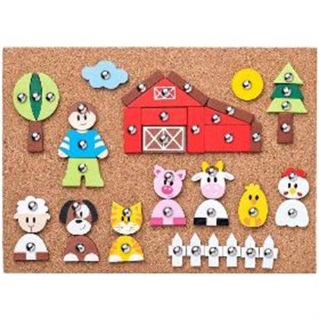 Stavebnice. WOODY Korková deska Zvířátka. . Děti dovedou z této stavebnice, pomocí kladívka a hřebíčků, vytvořit nekonečné variace obrázků. Vytvoří obrázky na téma zvířátka a lidé. Práce se stavebnicí podporuje představivost, soustředěnost a přesnou koordinace pohybů. Návrh a design českého autora. . Obsahuje:. 1 korkovou desku. 2 dřevěná kladívka. 80 hřebíčků. 70 dřevěných tvarů. . 150 dílků. . Věk 5+. Rozměr 21 x 31 cm
