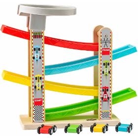Autodráha. WOODY Dráha pro autíčka. . Hračka pro nejmenší. Dítě umístí autíčka na horní plochu dráhy, naklopí ji a autíčka sjedou po dráze dolů. Rozvoj jemné motoriky a koordinace oko-ruka. . Věk 11+. Rozměry (VxŠxH) 27 x 31 x 10 cm