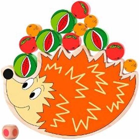 Balanční hra. WOODY Balanční hra Ježek. . Hra a didaktická pomůcka v jednom. Hráči hází kostkou, na jejíž stranách jsou barevné puntíky. Barva hráči napoví, které ovoce bude na ježka pokládat. Úkolem hráče je položit na ježka ovoce tak, aby se ježek nepřevážil a ovoce ze svého hřbetu nevysypal. . Věk 3+. Rozměry 17 x 11 cm
