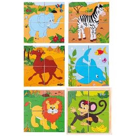 Kostky. WOODY Kubus 2x2 - Safari. . Obrázky pocházejí z dílny českých návrhářů. Tyto kostky byly vytvořené pro děti od 2 let. Obrázek je proto složen pouze ze 4 dílů - kostek. Safari motivy - slon, velbloud, žirafa, lev, opice a delfín. . 4 kostky. . Věk 2+. Rozměry (VxŠxH) 5 x 12 x 12 cm