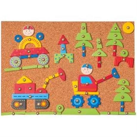 Stavebnice. WOODY Korková deska Auta. . Děti dovedou z této stavebnice, pomocí kladívka a hřebíčků, vytvořit nekonečné variace obrázků plných fantazie. Práce se stavebnicí podporuje představivost, soustředěnost a přesnou koordinaci pohybů. . Obsahuje:. 1x korková deska. 2x kladívko. 100x hřebíčky. 126x dřevěné tvary. . 229 dílků. . Věk 5+. Rozměr desky 21 x 31 cm
