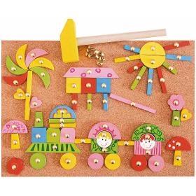 Stavebnice. WOODY Korková deska Růžová. . Děti dovedou z této stavebnice, pomocí kladívka a hřebíčků, vytvořit nekonečné variace obrázků plných fantazie. Práce se stavebnicí podporuje představivost, soustředěnost a přesnou koordinaci pohybů. . Obsahuje:. 1x korková deska. 2x kladívko. 100x hřebíčky. 126x dřevěné tvary. . 229 dílků. . Věk 5+. Rozměr desky 21 x 31 cm