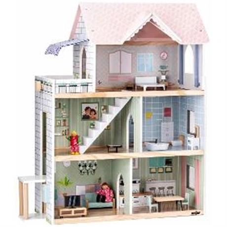 Domeček pro panenky. WOODY Domeček pro panenky Molly. . Kvalitní třípatrový domeček pro panenky včetně příslušenství - 17 ks. Nábytek je vyroben z kombinace materiálů dřevo a plast. Z přízemí do prvního patra se mohou panenky svézt výtahem. U vchodu je umístěn domovní zvonek. Třetí patro je vybaveno nejen prostornou terasou a markýzou, ale i funkčním světlem. Baterie 2x CR2032 nejsou součástí balení. . Věk 3+. Rozměry (VxŠxH) 80 x 63,5 x 31 cm