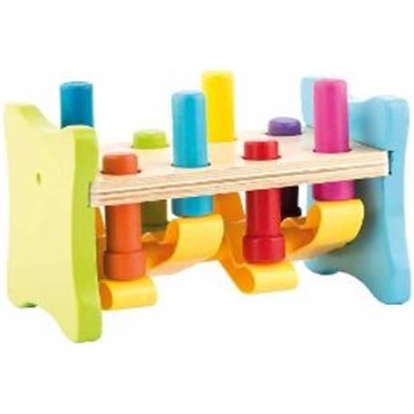 Zatloukačka. WOODY Zatloukačka Up and Down. . Nová vylepšená varianta klasické dřevěné zatloukačky. Tentokrát v kombinaci dřevo/plast. Kromě nově použité kombinace materiálu a barev je zde novinkou hlavně systém, na kterém tato zatloukačka funguje. Její kolíky jsou v párech proti sobě připevněny na plastovou "kolíbku". Zatlučením kolíku na jedné straně se dostane druhý kolík automaticky nahoru a je opět připraven k protlučení. . Věk 2+. Rozměr 13 x 22,5 cm