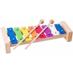 Xylofon. WOODY Kovový xylofon. . Xylofon patří mezi bicí nástroje. Jeho kovové plátky jsou usazeny na filcových kroužcích, které regulují ostrost zvuku. Dřevěný rám i paličky propůjčují zvuku hloubku a sametový tón. . Věk 3+. Délka 25,5 cm