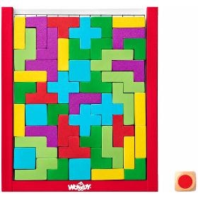 Hlavolam. WOODY Hlavolam s kostkou. . Dítě hází kostkou a podle hozené barvy vkládá jednotlivé kousky skládanky do krabičky. Skládá je tak, aby do sebe správně zapadaly a nevytvářely se prázdná místa. . 48 dílků. . Věk 3+. Rozměry (VxŠxH) 1,5 x 14,5 x 17 cm